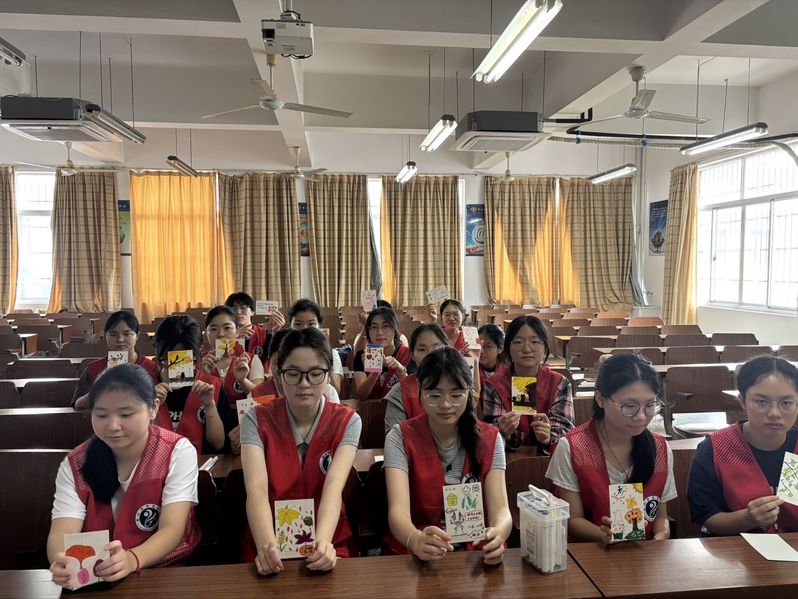 活动当天上午8时55分,志愿者们身着统一志愿服,在商学院一楼有序集合领取物资、整队集合,9时准时抵达二楼4224教室完成志愿汇签到。活动伊始,商青志活动负责人走上台前,以生动的语言讲解秋分节气的起源——从“昼夜均而寒暑平”的自然特征,到古人祭月、庆丰收的传统习俗,让志愿者们在轻松的氛围中读懂节气背后的文化内涵。随后,工作人员为每人分发水彩笔、空白明信片与彩色粘土,一场“留住秋意”的手工创作正式开启。