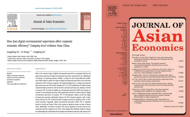 近日,我院杜龙政教授与其合作者共著的学术论文《How does digital environmental supervision affect corporate economic efficiency? Company-level evidence from China》在国际权威学术期刊 Journal of Asian Economics上正式发表。该期刊为中国科学院二区、JCR一区期刊,2025年影响因子为3.4,在经济学类期刊中排名第97位(共617种)。在亚洲经济、区域治理和可持续发展研究领域具有较高国际影响力和学术认可度。