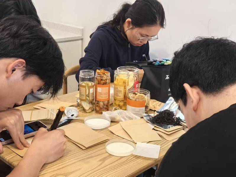 活动现场,工作人员精心准备了品类丰富的袋泡茶原料,包括龙井、铁观音、普洱等各类经典茶叶,以及柠檬片、蔓越莓干、玫瑰花、薄荷叶等花草果干,如同一场原料的“盲盒”盛宴,极大地激发了同学们的创作热情。茶文化研究会的成员们为同学们细致地讲解了袋泡茶的组装方法与创意搭配,现场气氛热烈,大家在茶包创作中交流沟通,不仅增进了对茶文化的认知,还加深了彼此之间的交流与友谊。同学们纷纷发挥奇思妙想,将不同原料巧妙搭配,比如将红茶与柠檬片组合期待碰撞出茶香清爽的独特风味,又或者是将苹果干、百香果干、蜜桃干结合在一起,试图打造一杯果香交织的夏日特饮。无论是传统茶香爱好者,还是追求创新口味的同学,都在活动中找到了乐趣,制作出独具个性的袋泡茶,享受着亲手创造的过程。