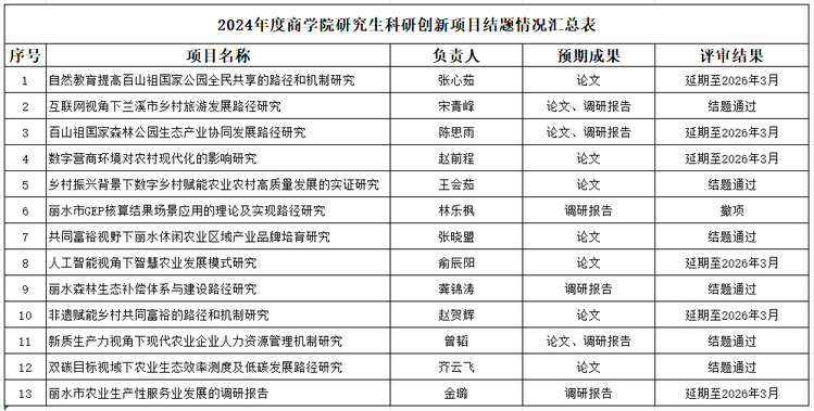 2024年度商学院研究生科研创新项目结题评审工作已结束。经个人提交结题材料、学院研究生教学督导组评审,“互联网视角下兰溪市乡村旅游发展路径研究”等 6个项目顺利结题,“自然教育提高百山祖国家公园全民共享的路径和机制研究”等6个项目延期至2026年3月,“丽水市GEP核算结果场景应用的理论及实现路径研究”项目撤项,现予以公布。
